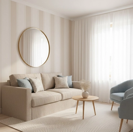 Les tons clairs et neutres, ainsi que les rayures fines ou motifs subtils, donnent l’illusion de profondeur et d’espace. Évitez les motifs trop chargés qui peuvent écraser la pièce.