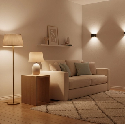 Les sources lumineuses multiples permettent de jouer avec les ambiances : une lampe d’appoint près du canapé pour la lecture, une suspension légère au-dessus de la table et des guirlandes discrètes pour un effet cosy. L’objectif est d’équilibrer fonction et esthétisme afin que chaque coin respire et invite à la détente 🌙.