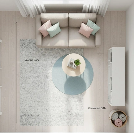 Jouez avec les volumes et les proportions : un canapé compact face à des étagères ouvertes ou des rangements discrets permet de structurer l’espace tout en gardant une circulation fluide et intuitive 🌸.