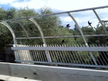 Voilà ce qu’on voit sur le « pont du suicide » je ne connais pas le vrai nom de ce pont mais il a été rebaptisé ainsi car à une époque il yavait beaucoup de suicides de ce pont, et il a fallu mettre ces vitres avec des oiseaux pour dissuader les suicidaires..