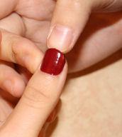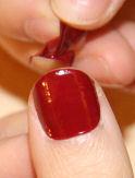 Après avoir bien lissé la surface de l’ongle avec le doigt, on retire l’excédent en repliant le vernis adhésif sous l’ongle
