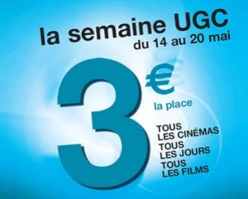 Les cinémas UGC vous proposent du 14 au 20 mai de payer 3€ votre place de ciné dans tous les cinémas UGC , tous les jours, toutes les séances et pour tous les films !! A ce prix là vous avez aucune excuse pour ne pas fréquenter les salles obscures 🙂