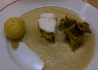 Lotte aux feuilles de figuier, savagnin & Dhjana, pommes de terre fumées