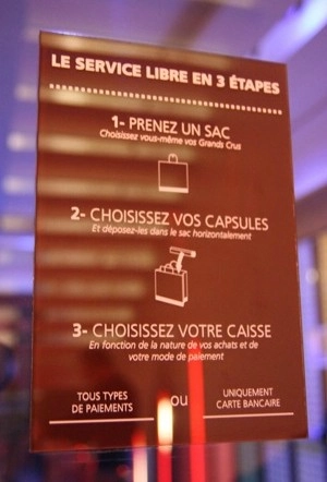 La particularité de cette boutique Nespresso, c’est le self-service . On choisit soi-même les capsules qu’on achète puis on règle via les caisses automatiques. Grâce à des puces qui sont à l’intérieur des emballages de chaque boîte, la machine détecte automatiquement les différentes boîtes de capsules que vous avez acheté et ainsi détermine le montant total à payer.