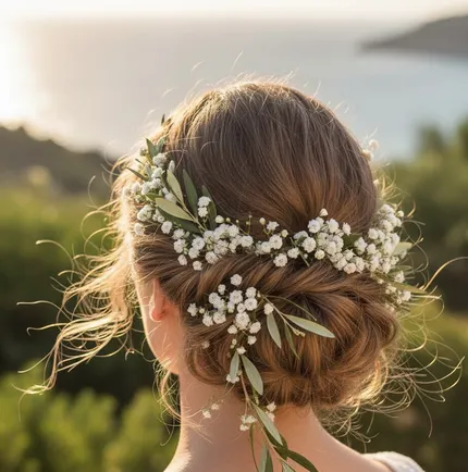 Pour un mariage en plein air, optez pour des coiffures légères qui résistent au vent et aux mouvements. 🌸 Pensez aux mini-œillets, gypsophile ou brins d’olivier pour une touche bohème naturelle et délicate.
