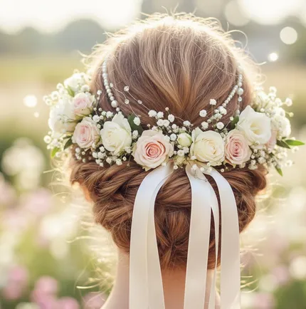 Pour sublimer une coiffure de mariage, quelques touches délicates peuvent faire toute la différence. 🌸 Des fleurs fraîches glissées dans un chignon flou ou une couronne tressée apportent une note romantique et vivante, tandis qu’un bijou discret ou un ruban satiné crée un éclat subtil sans voler la vedette.