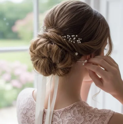 L’astuce est de rester subtile : la coiffure doit compléter la robe, les bijoux et l’ambiance sans jamais chercher à voler la vedette. Quelques touches choisies, comme une fine barrette ou un ruban pastel, suffisent à apporter de la magie.