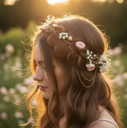 Pensez à la matière et à la lumière : satin, perles fines ou fleurs séchées captent le regard avec douceur et apportent un petit souffle poétique qui fait danser votre chevelure au rythme de la journée.