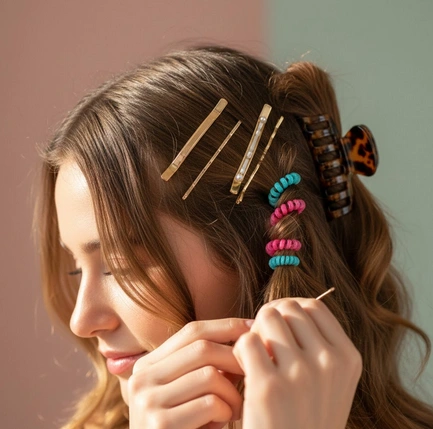 Choisissez des pinces originales ou des élastiques colorés pour structurer vos coiffures en un clin d’œil. Ils transforment instantanément un chignon ou une demi-queue simple en un look travaillé et personnel.