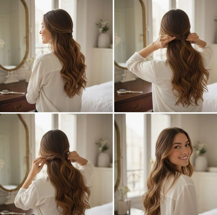 Un scrunchie en velours ou une pince bijou apporte instantanément du style et du relief à une demi-queue, tout en gardant la coiffure pratique et rapide à réaliser.