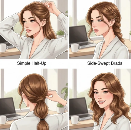 Pour les cheveux mi-longs, les demi-attachés et les tresses rapides sont de véritables alliés des matins pressés. Un demi-chignon simple, réalisé en séparant la chevelure de tempe à tempe, apporte une structure chic sans alourdir, et une pince discrète suffit à maintenir le tout avec élégance.