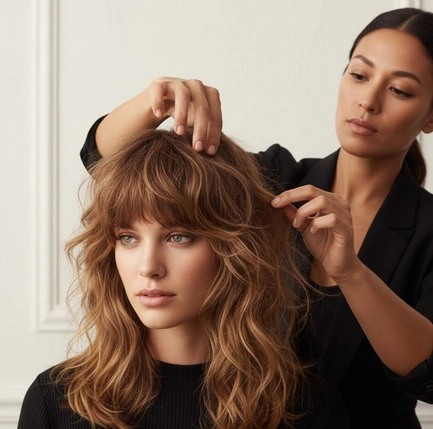 Une frange rideau convient aux visages ronds, tandis qu’un dégradé léger ou micro-frange sublime les visages ovales et carrés, équilibrant harmonieusement les volumes.