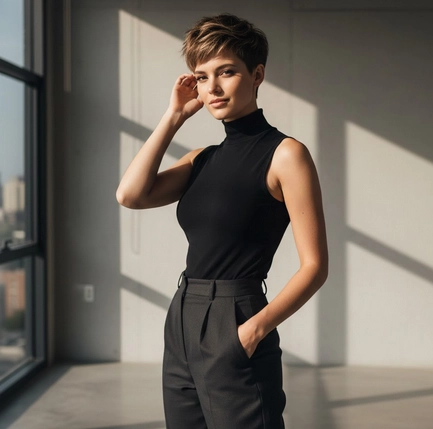 La coupe courte pour femme forte révèle la confiance et structure la silhouette avec élégance.