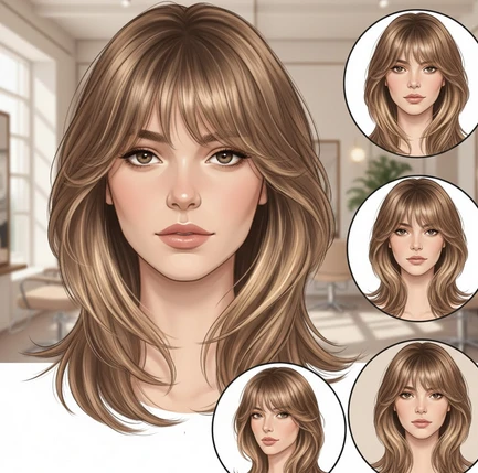 Cette version joue avec la légèreté des mèches autour du visage et une frange rideau modulable qui pivote selon le geste. Parfait pour adoucir les angles et donner un regard expressif, elle se coiffe en quelques minutes avec un spray texturisant pour un effet wavy naturel 🌊.