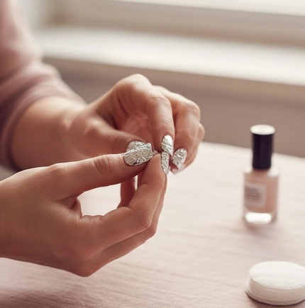 Appliquez le dissolvant avec soin sur chaque ongle, enveloppez-le dans du papier aluminium ou une papillote spéciale, et patientez quelques minutes. Pendant ce temps, profitez-en pour respirer profondément et transformer ce moment en un petit rituel de soin pour soi, presque méditatif 🌿.
