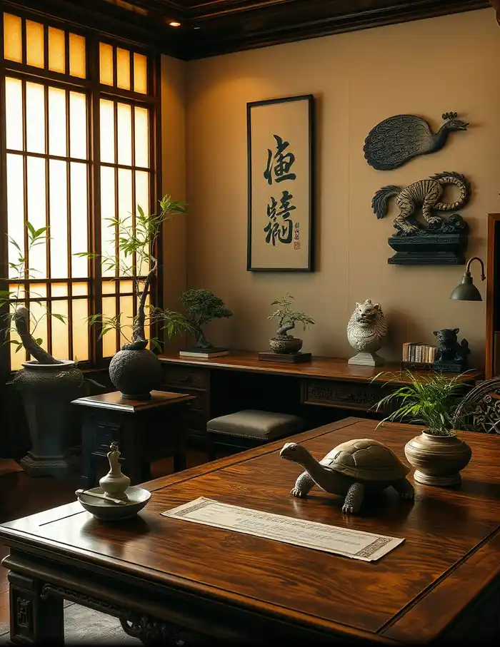 Les symboles Feng Shui ne se limitent pas à leur forme : ils dialoguent avec les couleurs, les textures et la lumière de votre intérieur. Un paravent orné d’un phénix en soie irisée, un tapis aux tons terreux rappelant la carapace d’une tortue, ou même une peinture murale subtile peuvent créer des ambiances harmonieuses et poétiques. Chaque détail devient alors une note dans la mélodie de votre espace.
