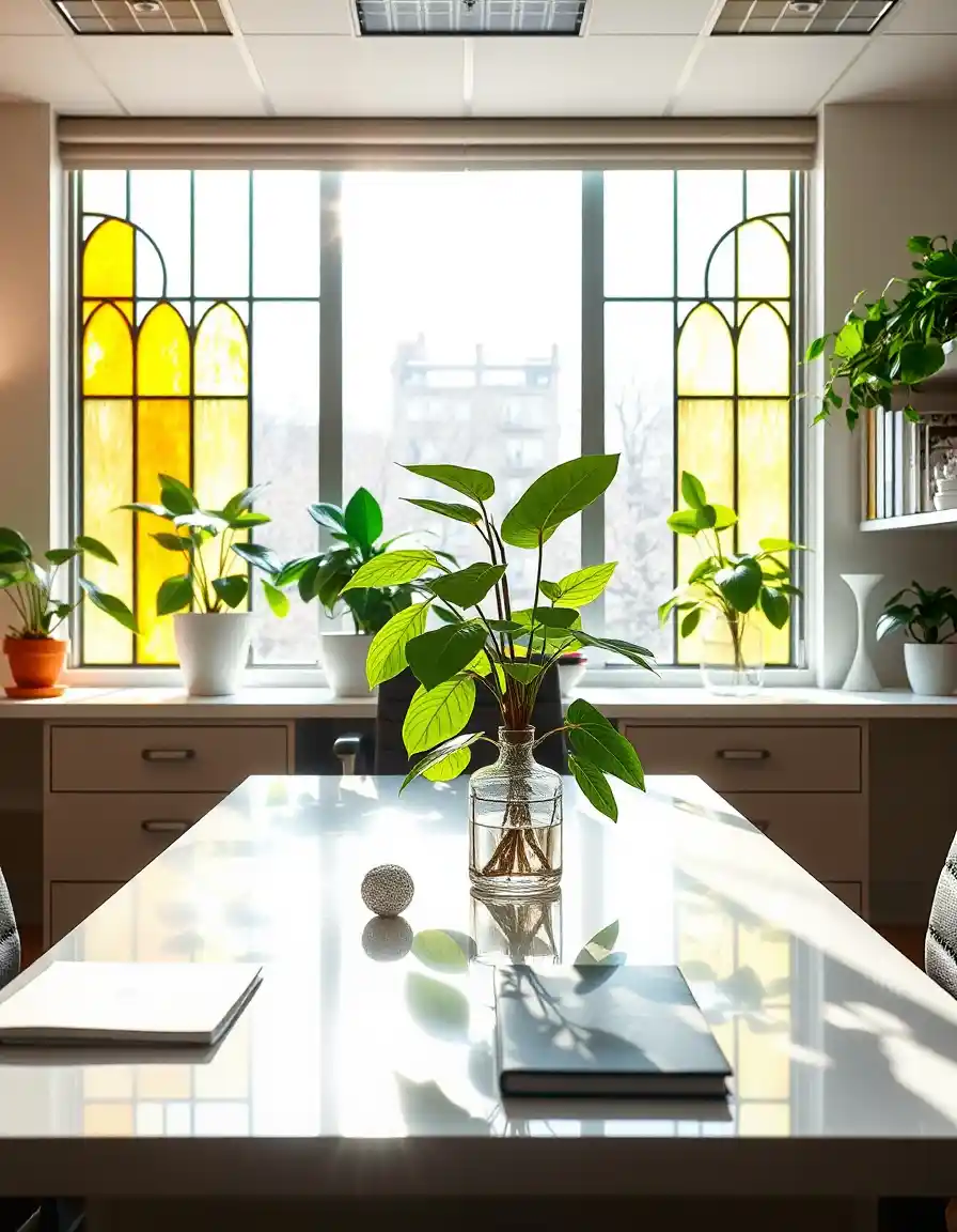 Pour amplifier cette harmonie, pensez aux petits détails : un vase de fleurs fraîches sur votre bureau, une plante grimpante sur une étagère, ou encore un brumisateur discret qui diffuse un voile léger d’humidité. Chaque élément participe à créer un environnement où le travail se fait avec fluidité et légèreté, tout en nourrissant votre énergie intérieure.