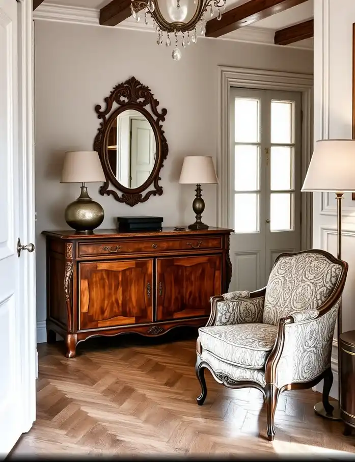 Une commode de famille peut devenir la pièce centrale d’une entrée contemporaine. Un miroir doré peut sublimer un mur sobre. Un fauteuil ancien retapissé dans un tissu moderne crée un joli pont entre les époques.