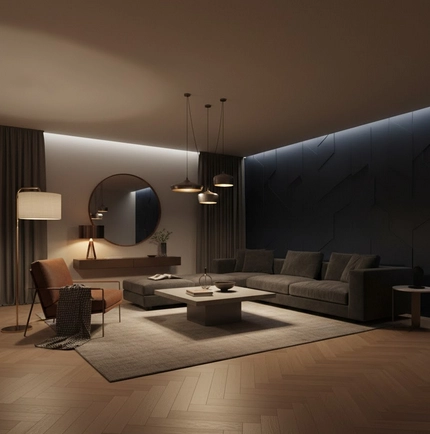 Jouez avec des surfaces réfléchissantes, des murs d’accent et l’éclairage stratégique pour guider l’œil et créer des perspectives qui élargissent la pièce.
