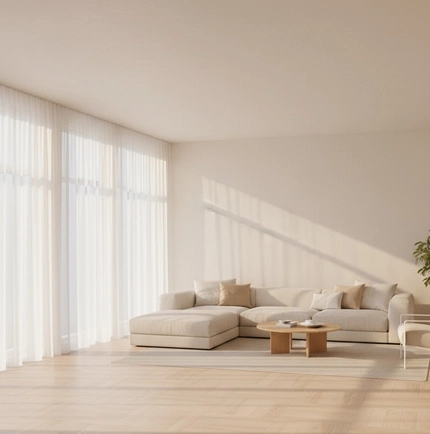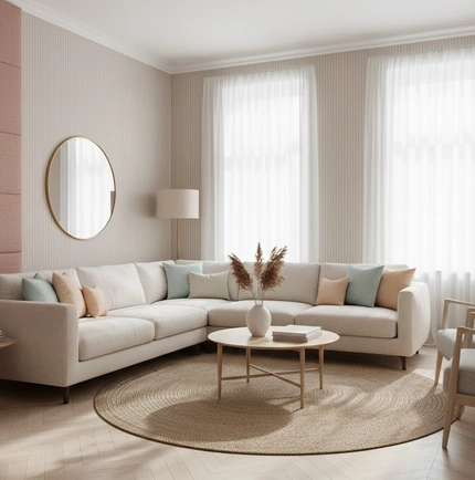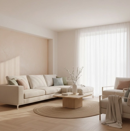Privilégiez les teintes claires et lumineuses comme les beiges doux, les blancs cassés ou les pastels, qui reflètent la lumière et agrandissent visuellement l’espace.