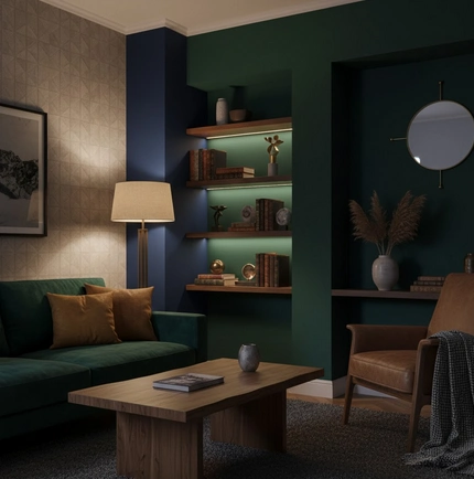 Les couleurs profondes, comme un bleu nuit ou un vert sapin, peuvent surprendre en donnant du caractère et de la profondeur à une pièce. Placées sur un mur stratégique ou en accent, elles apportent une dynamique élégante et soulignent subtilement les volumes, créant un effet cocon raffiné.