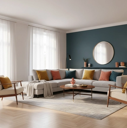 Oser quelques accents colorés sur un mur, un meuble ou un objet décoratif crée un point focal et dynamise l’espace. Le bleu profond, le vert sapin ou un jaune chaleureux apportent profondeur et personnalité, tout en soulignant subtilement les volumes et les perspectives de la pièce.