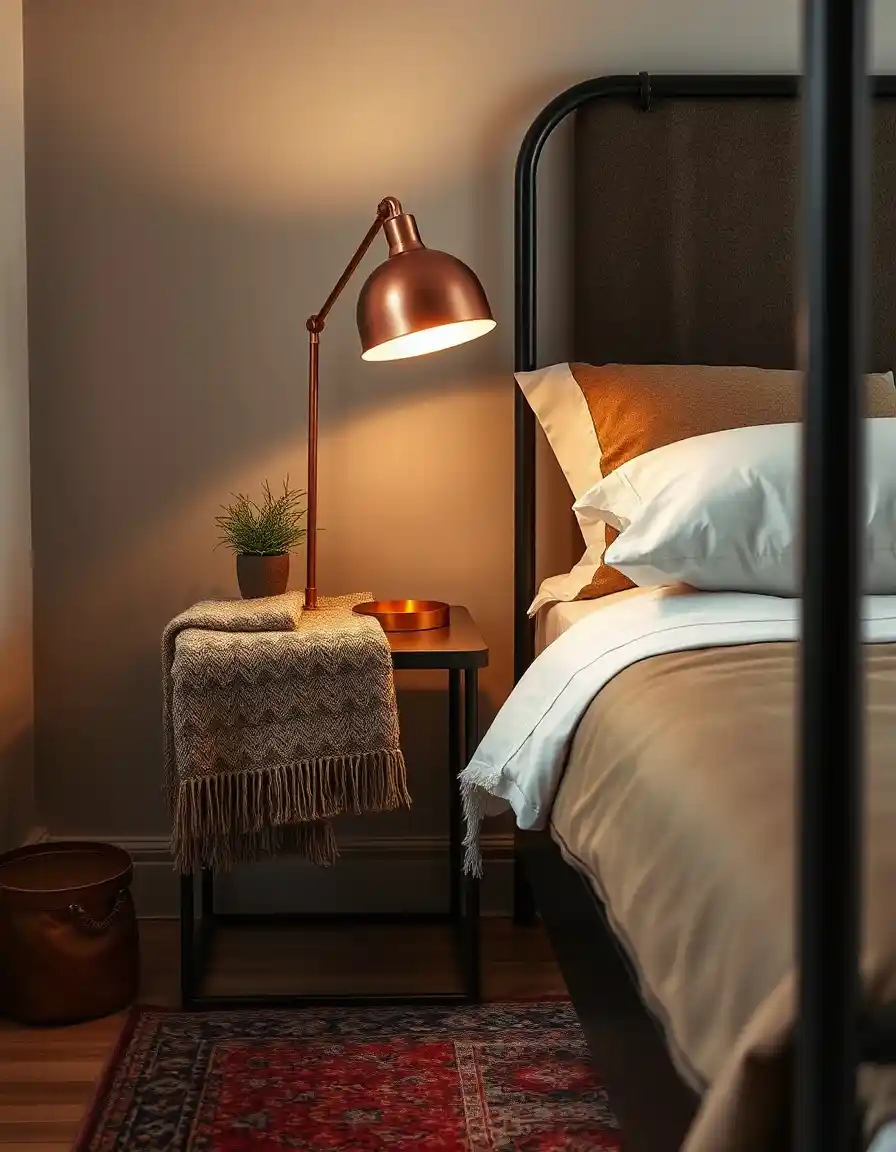 Le design industriel séduit par son allure brute et authentique, où le métal et le bois se répondent avec élégance. Une table de chevet en acier noir ou en métal vieilli, associée à une lampe en cuivre ou à un luminaire suspendu, apporte immédiatement une note urbaine et sophistiquée à la chambre.