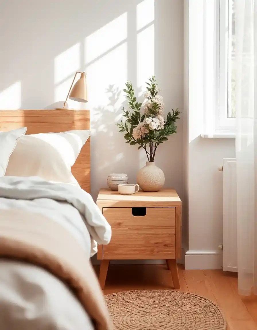 Le style scandinave séduit par sa simplicité lumineuse et ses lignes épurées. Une table de chevet en bois clair, aux formes douces et minimalistes, s’intègre parfaitement dans une chambre baignée de lumière naturelle, créant une atmosphère apaisante et raffinée.