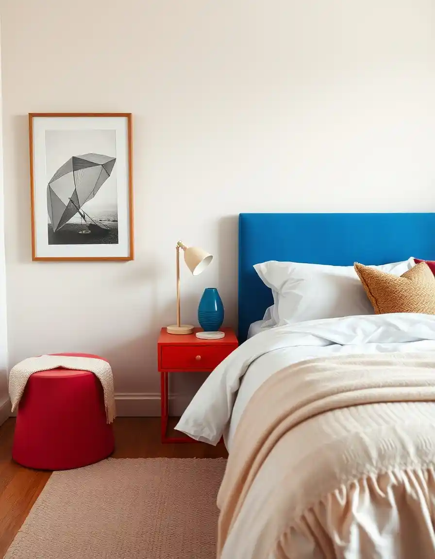 Oser les couleurs vives et les contrastes forts transforme instantanément une chambre en un lieu vibrant et plein de caractère. Une table de chevet peinte dans un rouge profond ou un bleu électrique devient bien plus qu’un simple meuble : elle devient un point focal, qui attire le regard et éveille la pièce.