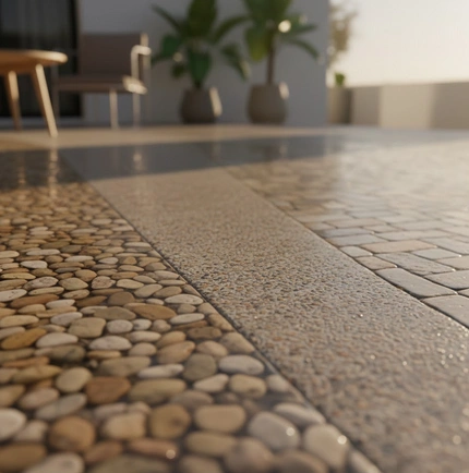 | 🔹 Finition personnalisée | Incorporation de pigments, paillettes ou inserts décoratifs | Terrasse unique, éclats scintillants ou détails originaux pour un effet sur-mesure |