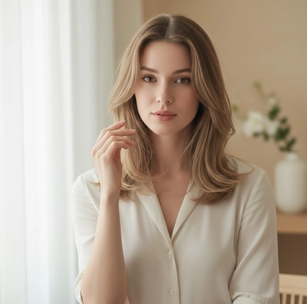 Le hair contouring associé à un balayage subtil met en lumière les lignes naturelles du visage, sculptant les traits avec douceur et élégance. Les mèches stratégiquement placées apportent profondeur et volume discret sans alourdir la chevelure.