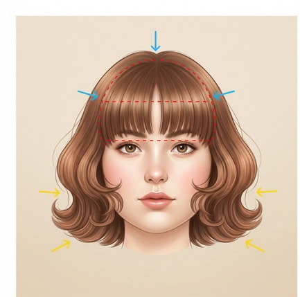 Certaines coiffures peuvent alourdir visuellement un visage rond : pensez aux franges épaisses, aux cheveux ultra lisses et à la raie centrée qui fixent la masse sur les joues et ferment le front.