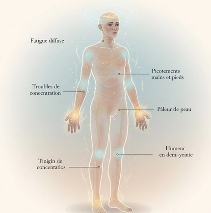 Une carence en vitamine B12 peut se manifester subtilement, avec une fatigue persistante, des picotements dans les mains ou les pieds, et parfois un moral en demi-teinte. MĂȘme une peau un peu pĂąle ou un souffle court peuvent signaler un dĂ©ficit insoupçonnĂ©.