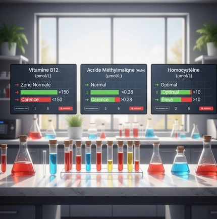 Pour vĂ©rifier, un simple dosage sanguin suffit, rapide et sans jeĂ»ne, et parfois accompagnĂ© de marqueurs comme lâacide mĂ©thylmalonique ou lâhomocystĂ©ine pour confirmer un dĂ©ficit tissulaire.